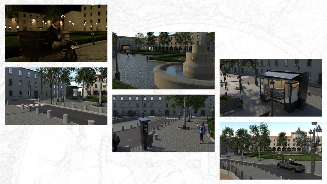 Sur un budget relativement serré, la tâche consista à : analyser les besoins dans le cadre de la R&D, élaborer le design urbain, modéliser l’environnement, texturer et éclairer la scène, rigging et posing des personnages, configurer la scène afin que les différents réglages soient accessibles le plus simplement possible, les milliers d’images nécessaires étant calculées côté client.
