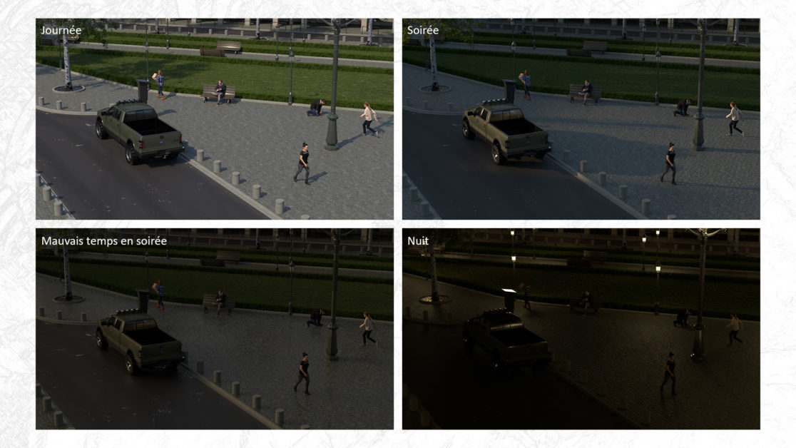 Projet pour Oktal-SE consistant à une simulation de vidéosurveillance sous 4 angles différents à différent moment de la journée et météo variable. Le but : fournir un data-set d’images pour entrainer un réseau neuronal. Le cahier des charges étaient relativement simple, rendre une zone urbaine de manière photoréaliste tout en pouvant évoluer à 360° autours d’un point d’intérêt.